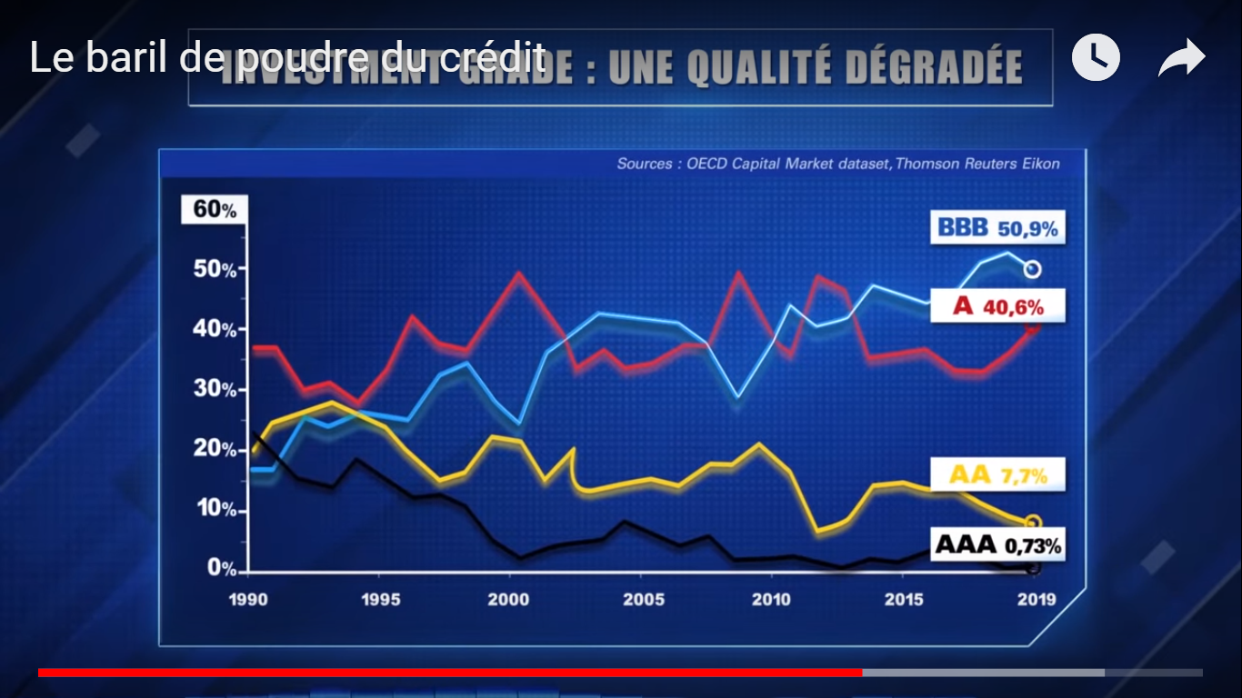 Or la dette de l’Etat italien (le plus endetté de la zone euro à 130% environ du PIB) était encore notée « investment grade » par les principales agences de notation. Mais une légère dégradation de sa note de BBB- (Standard and Poor’s) à BB+ classerait la note de l’Italie dans le haut de la série de notes classées « spéculative ».