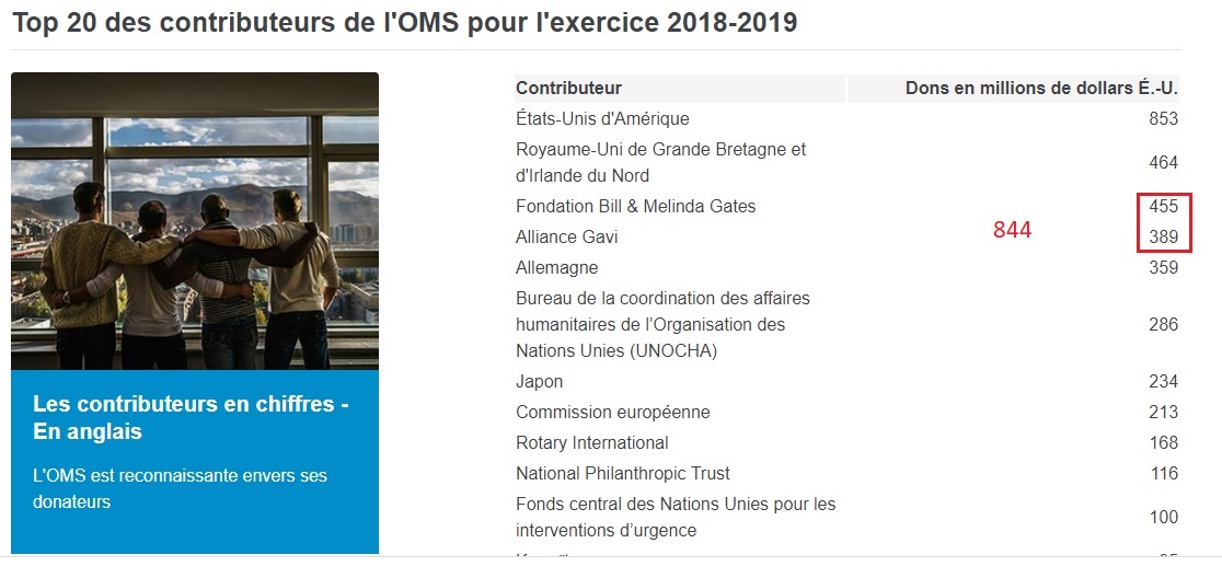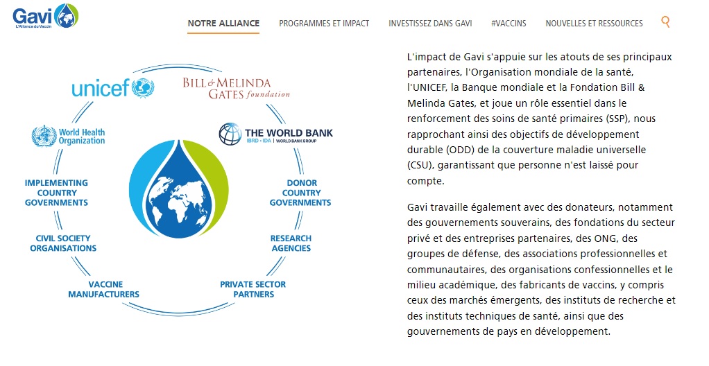 A travers  GAVI et sa fondation, la famille Bill Gates, fondateur de Microsoft, est désormais le principal pourvoyeur de fonds de l’OMS depuis que les Etats Unis se sont retirés du financement :