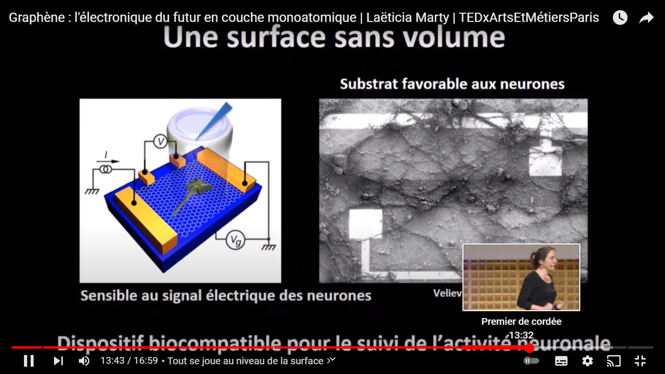 Conférence Laëtitia Marty, chercheuse au CNRS, docteur en physique, expliquant comment les neurones interagissent avec le graphène contenu dans les doses à injecter. Les neurones sont les cellules du système nerveux et donc de notre cerveau. Elles produisent un courant électrique qui peut alimenter des transistors de graphène. Le graphène a des propriétés uniques et extraordinaires.  Le graphène est biocompatible et très « accueillant pour les neurones ». Un tel couple fonctionne comme des « sondes de l’activité neuronale » et donc des sondes de notre cerveau. Les transistors sont utilisés depuis des années pour émettre un signal radio.