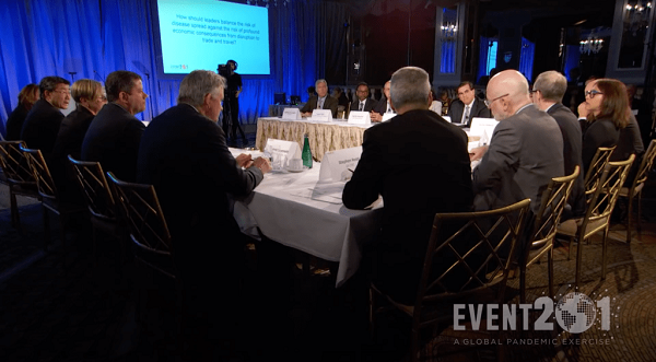 En octobre 2019, l’Union Européenne participe à une simulation nommée Event201 sur la réponse à apporter à une pandémie de coronavirus. La réunion est organisée par la fondation Bill et Melinda Gates, et le Forum de Davos.