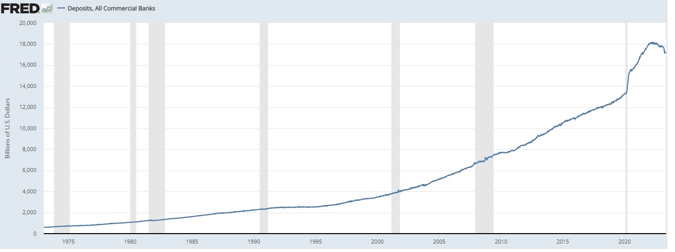 Pour ce qui est de la crise bancaire, comme le montre la courbe ci dessous, depuis que la Fed compile les données de cet indicateur, la somme des dépôts de toutes les banques commerciales de Etats-Unis a toujours augmenté notamment parce que les crédits font les dépôts et que la dette US n’a jamais baissé depuis 1973.